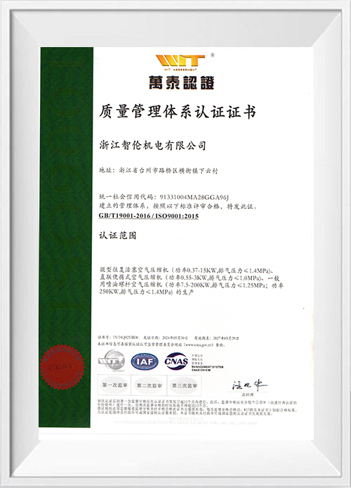 Zhejiang Zhilun Mechanical & Electrical Co., Ltd. é uma fábrica especializada em P&D, fabricação e vendas de compressores de ar de pistão e parafuso. Nossa empresa está localizada na cidade de Hengjie, distrito de Lugiao, cidade de Taizhou, a apenas 3 km do aeroporto de Taizhou e a 220 km do porto de Ningbo. O trânsito é muito conveniente para você nos visitar. Nossa empresa possui uma área de 50.000 metros quadrados e conta com mais de 300 funcionários.